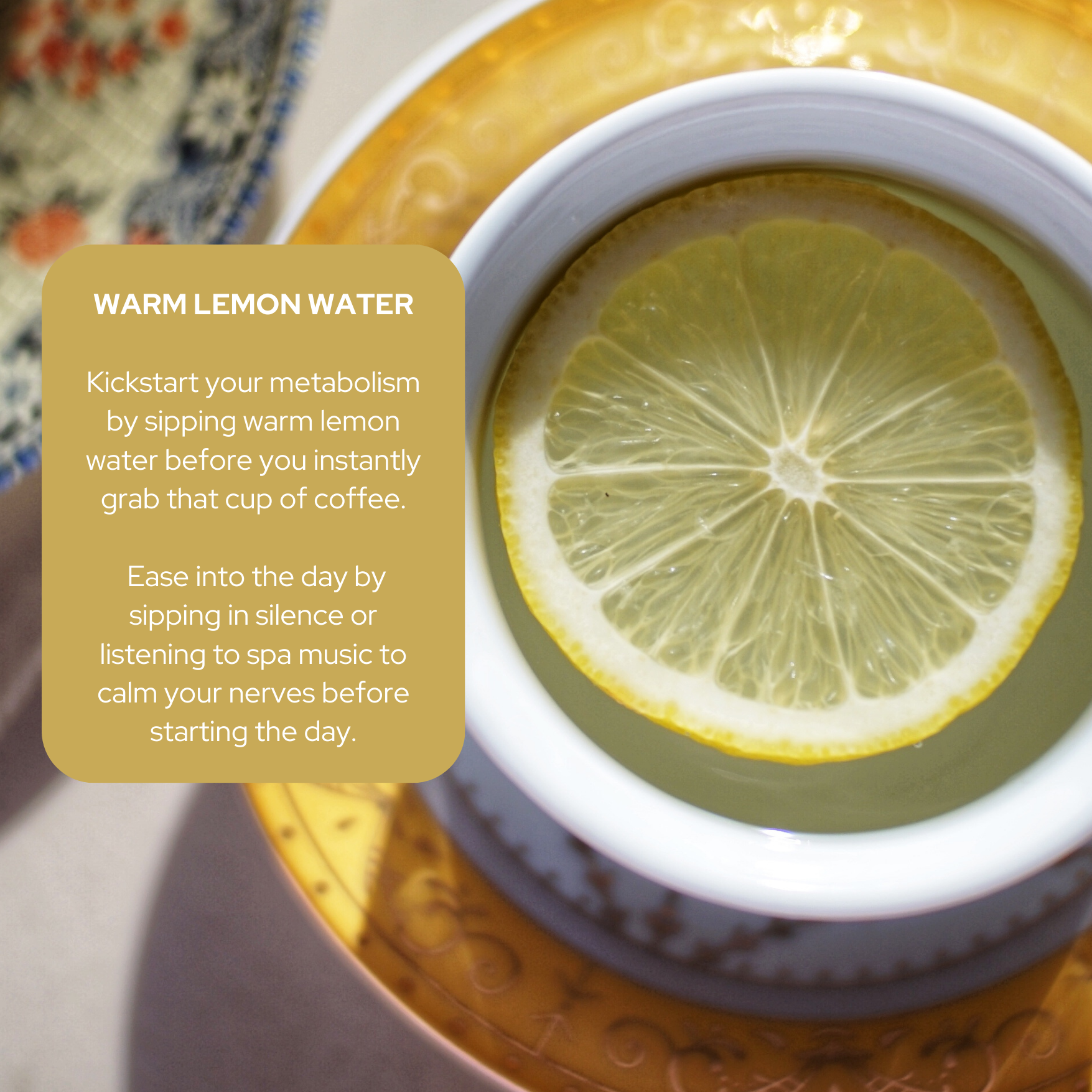 Boost your metabolism with a revitalizing sip of warm lemon water at the start of each morning. Begin your day in peace, either in silence or accompanied by soothing spa music, setting the stage for a calm and focused mindset.