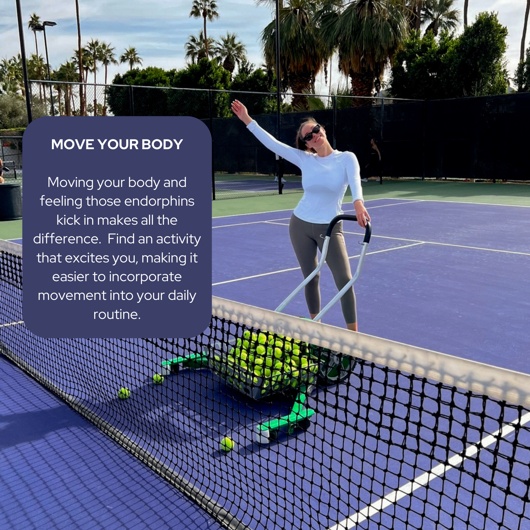 When those endorphins kick in, it makes all the difference mentally and physically. Find an activity that excites you, making it easier to incorporate movement into your daily routine. (Whitney loves tennis, yoga and swimming.)