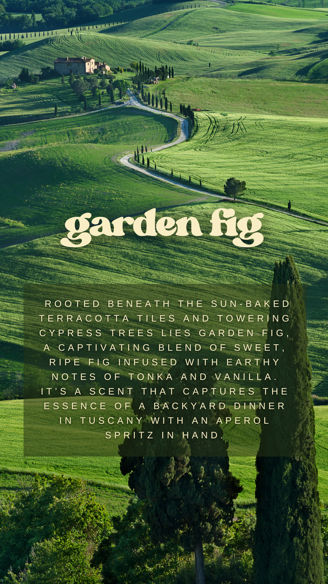 Rooted beneath the sun-baked terracotta tiles and towering cypress trees lies Garden Fig, a captivating blend of sweet, ripe fig infused with earthy notes of tonka and vanilla. It’s a scent that captures the essence of a backyard dinner in Tuscany with an Aperol Spritz in hand.
