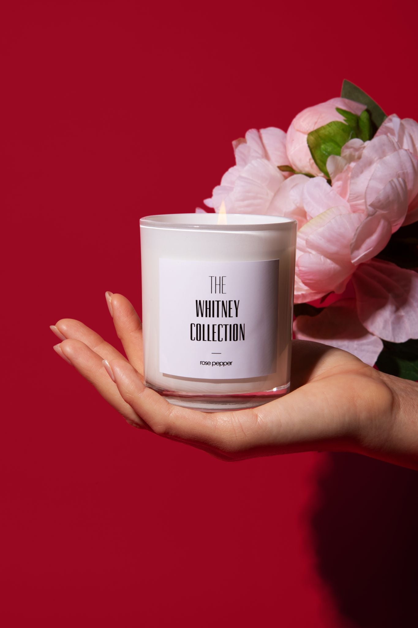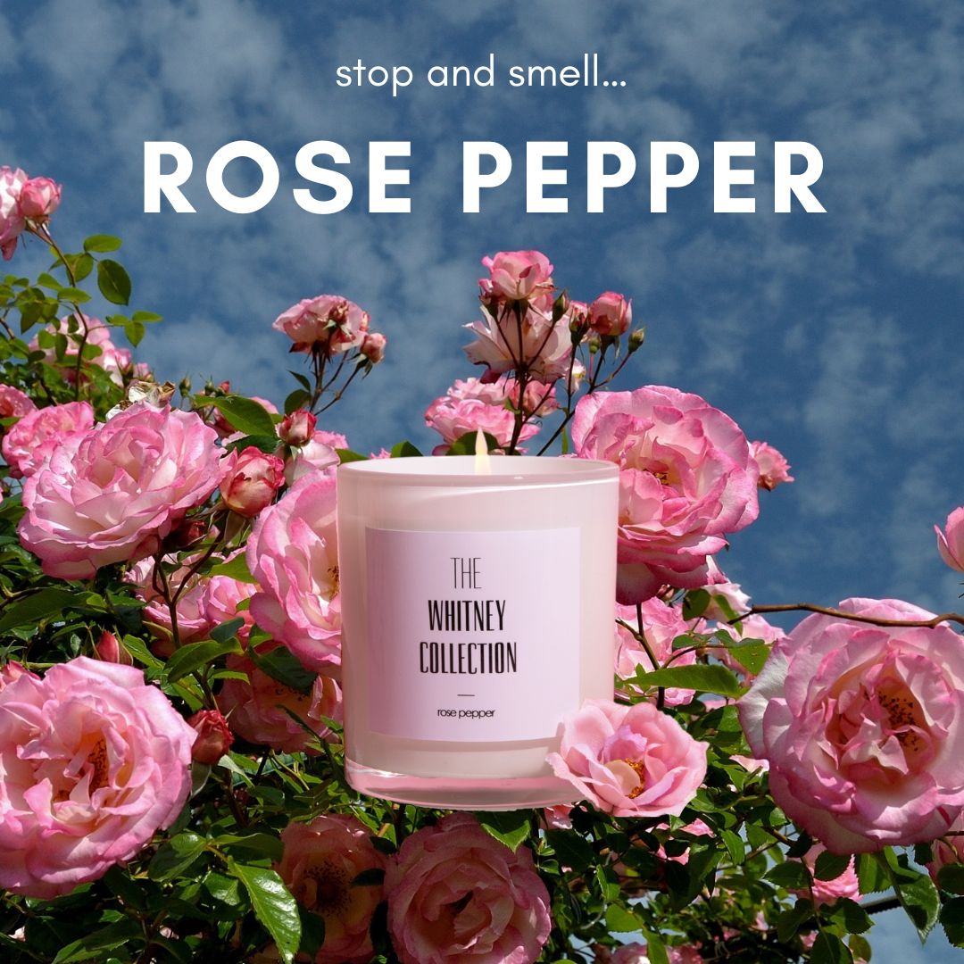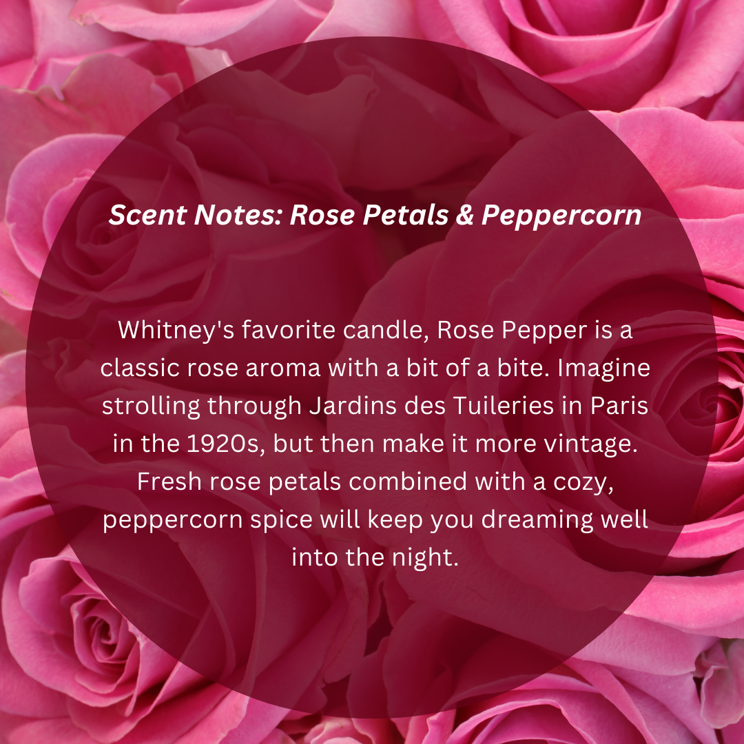 Whitney's favorite candle, Rose Pepper is a classic rose aroma with a bit of a bite. Imagine yourself strolling through Jardins des Tuileries in Paris in the 1920s, but then make it more vintage. Fresh rose petals combined with a cozy, peppercorn spice will keep you dreaming well into the night.